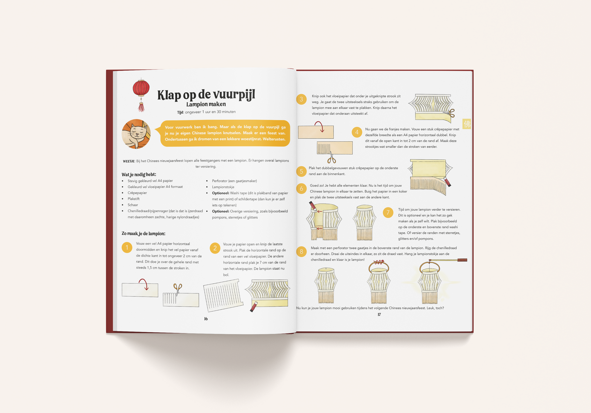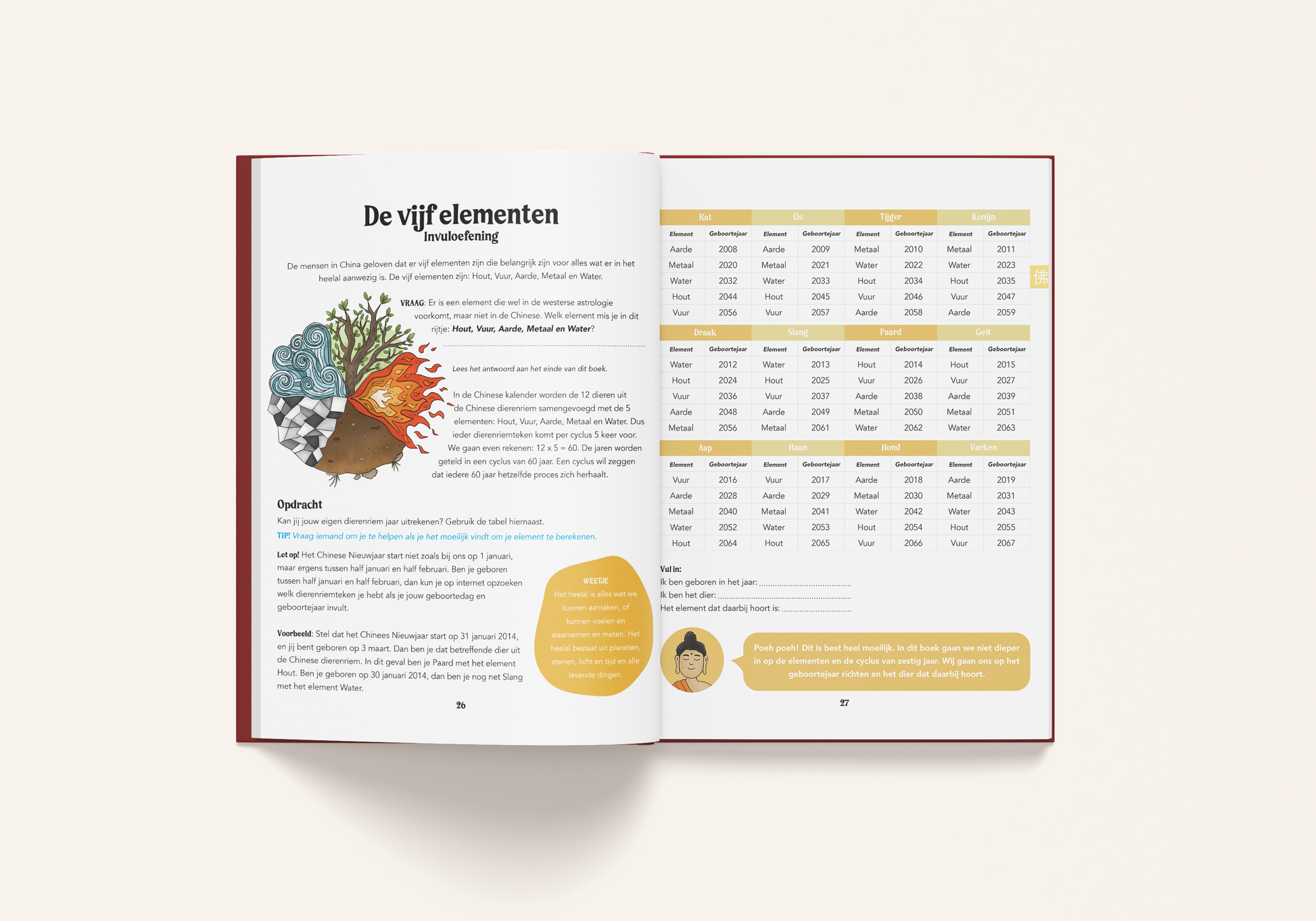 Ontdek de verhalen van Rat, Os, Tijger, Konijn, Draak, Slang, Paard, Geit, Aap, Haan, Hond en Varken in dit kleurrijk geïllustreerde yoga doe-boek.